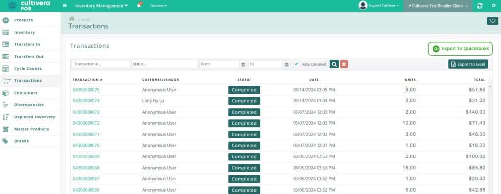 The Transactions screen is a master list of all the transactions that have taken place in the system in the location you have selected at the top right of the screen. The full list can be exported in Excel or Quickbooks format.